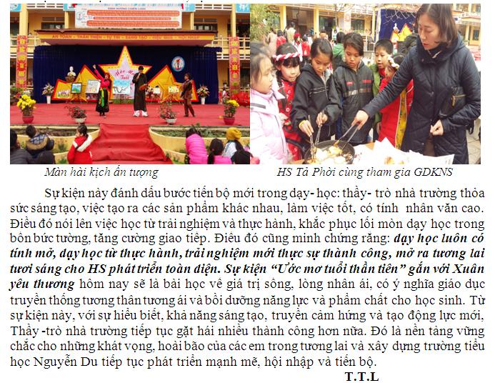 LỊCH SỬ XÂY DỰNG VÀ PHÁT TRIỂN NHÀ TRƯỜNG: Trường Tiểu học Nguyễn Du được thành lập ngày 15/8/2002. Tuy mới được thành lập hơn 10 năm nhưng trường đã tạo dựng được một bề dày thành tích rất đáng tự hào. Ngay từ ngày đầu Ban giám hiệu cùng với tập thể...