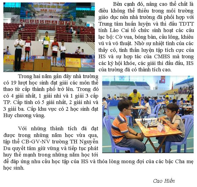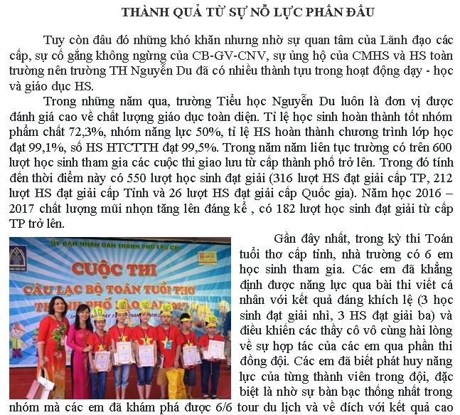 LỊCH SỬ XÂY DỰNG VÀ PHÁT TRIỂN NHÀ TRƯỜNG: Trường Tiểu học Nguyễn Du được thành lập ngày 15/8/2002. Tuy mới được thành lập hơn 10 năm nhưng trường đã tạo dựng được một bề dày thành tích rất đáng tự hào. Ngay từ ngày đầu Ban giám hiệu cùng với tập thể...