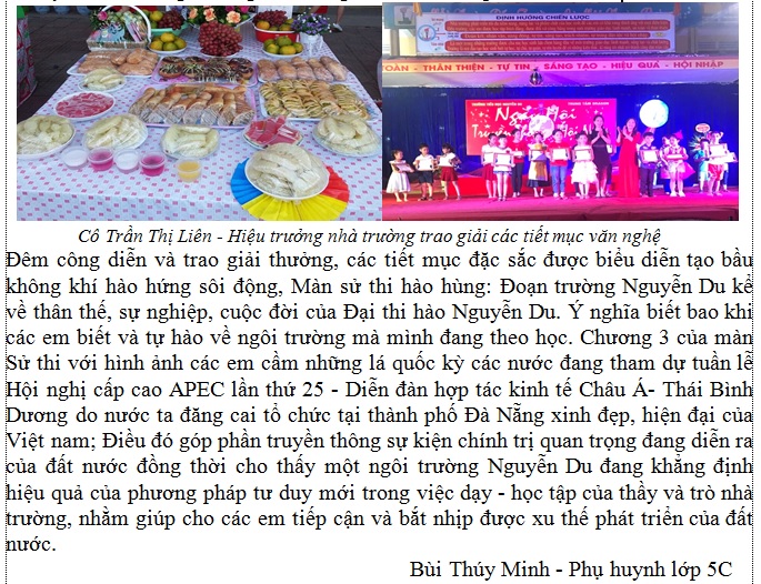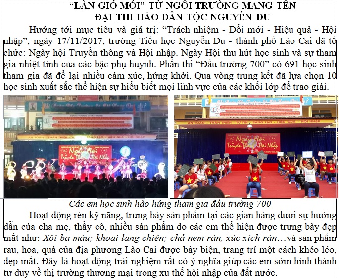 Nhân ngày Nhà giáo Việt Nam 20/11/2019, trường TH Nguyễn Du tổ chức sự kiện trường học "Thắp sáng ước mơ". Đến dự và chúc mừng các thầy cô nhà trường có đồng chí Đoàn Đình Khôi, Ủy viên Ban chấp hành Đảng bộ TP - Phó Chủ tịch HĐND thành phố Lào Cai, đồng chí Trần Văn Thiện, trưởng phòng Nội vụ thành phố, bà Phạm Thị Liễu, phó chủ tịch UBND phường Kim Tân,...